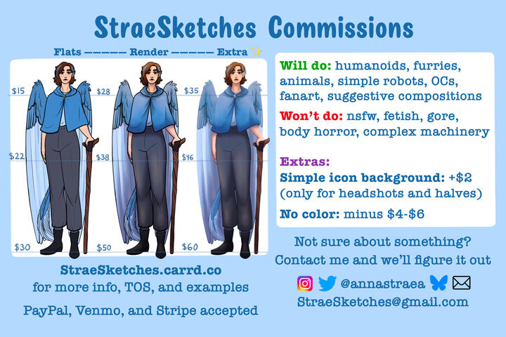 References: I will request reference of the desired character and pose. These can be a stickman drawing, pose refs from the internet or other source, an in-depth description of character appearance, etc. DO NOT send me an "AI" generated image as reference.